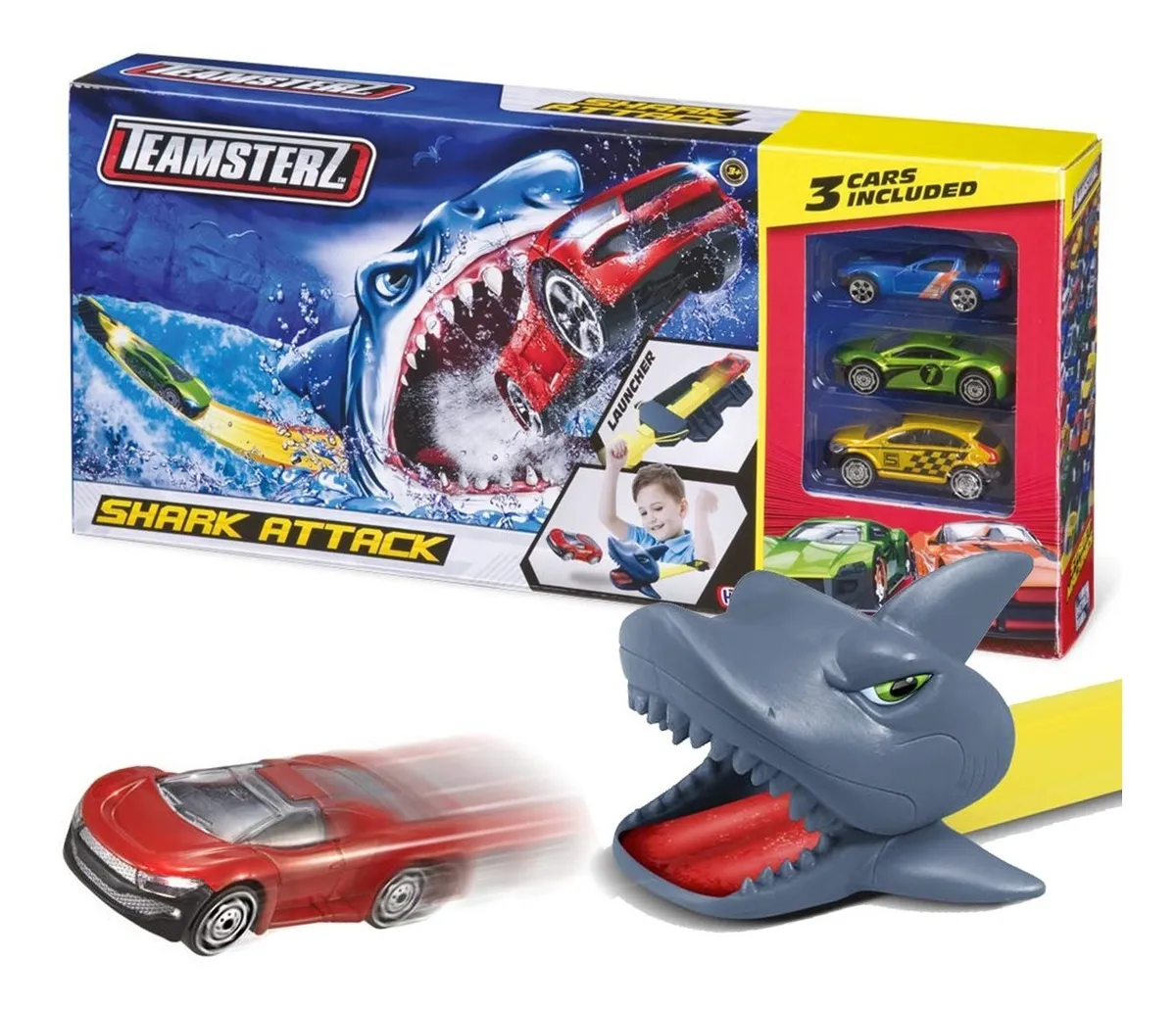 ¡Prepárate para la aventura más alocada con el TEAMSTERZ SHARK ATTACK SET DE LANZAMIENTO! ¡Dispara tus autos a toda velocidad y corre por tu vida mientras intentas escapar del tiburón más temido y hambriento del océano!